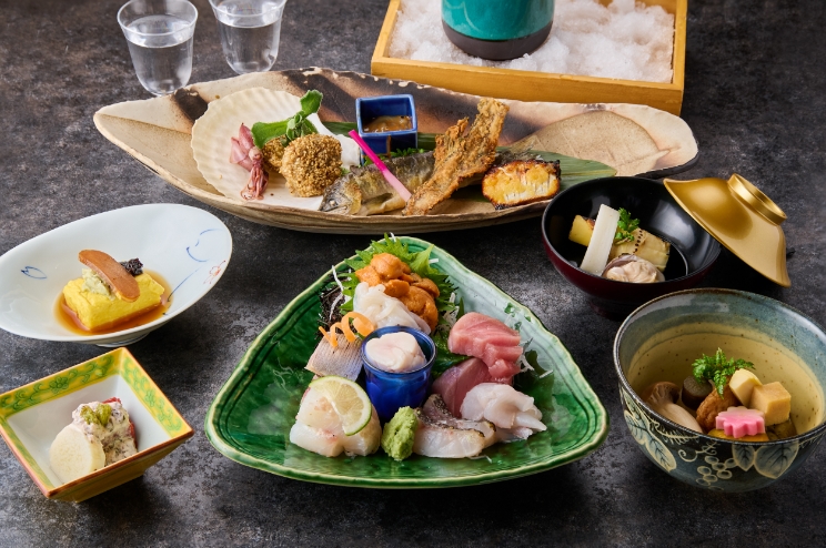 雪 先附、珍味、お造り8点盛、煮物、小鉢、茶碗むし、豆腐のサラダ、ごはん、赤だし、デザート |